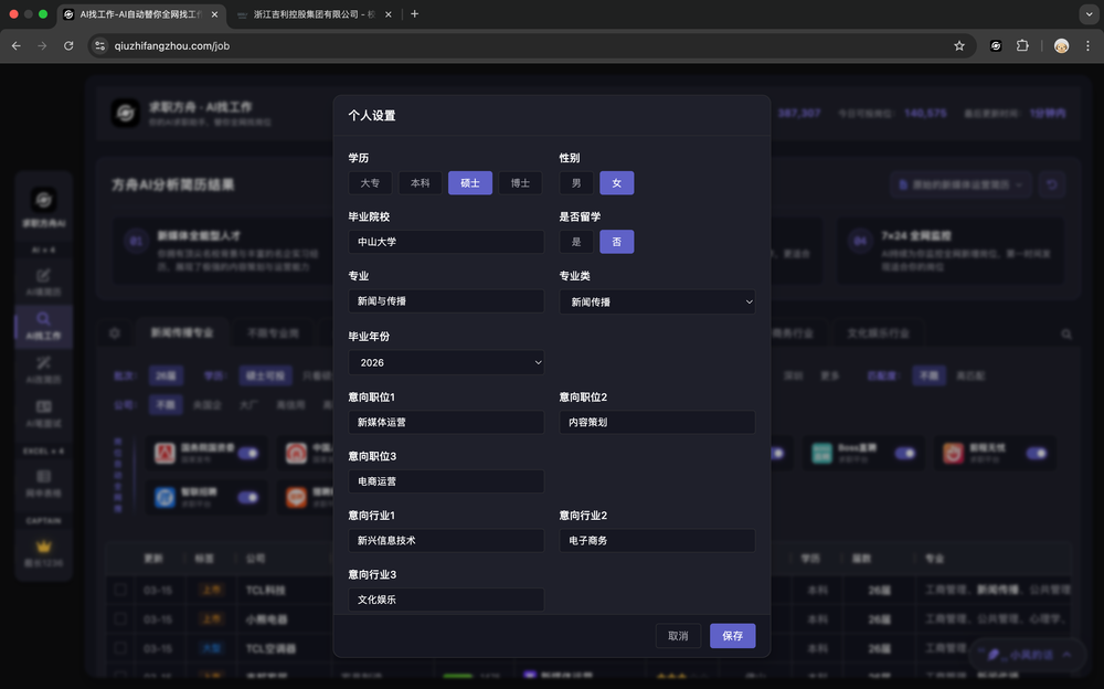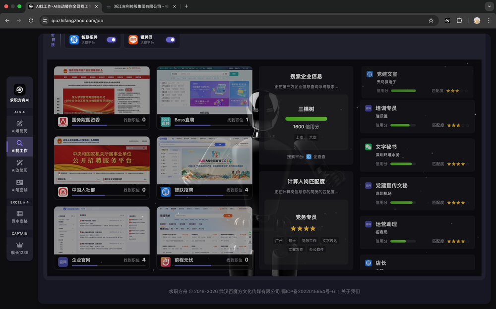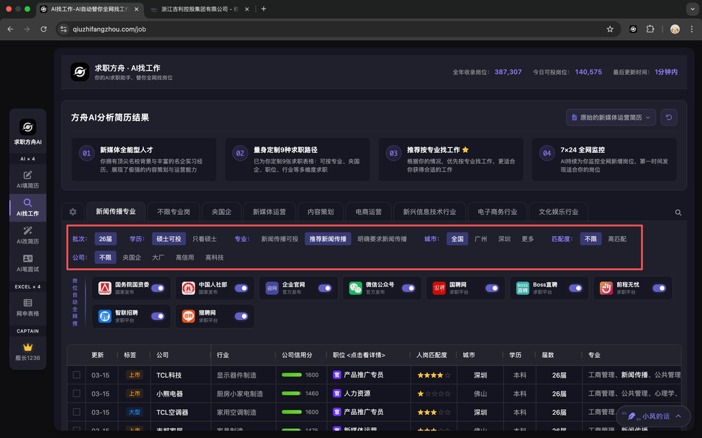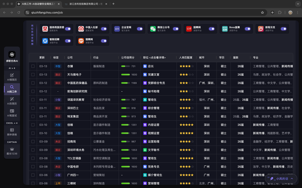 - 全渠道覆盖:监控 8000+ 大厂官网、国资委/人社部/事业单位、国聘/Boss/智联等主流平台,以及 985/211 高校就业办,一站汇总岗位信息。