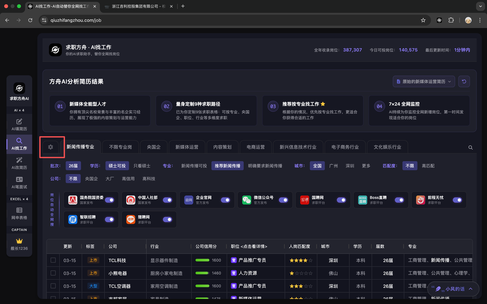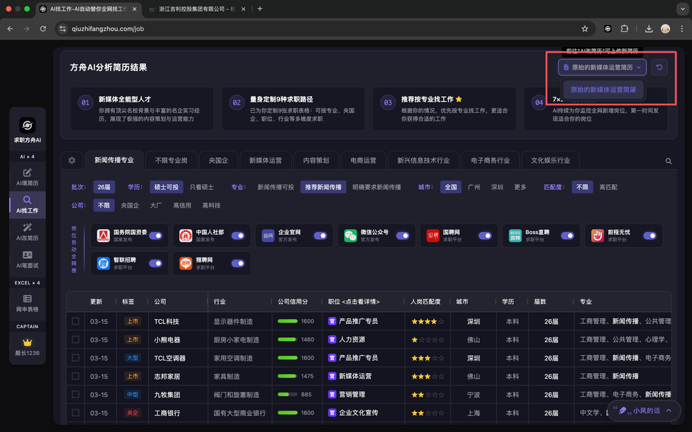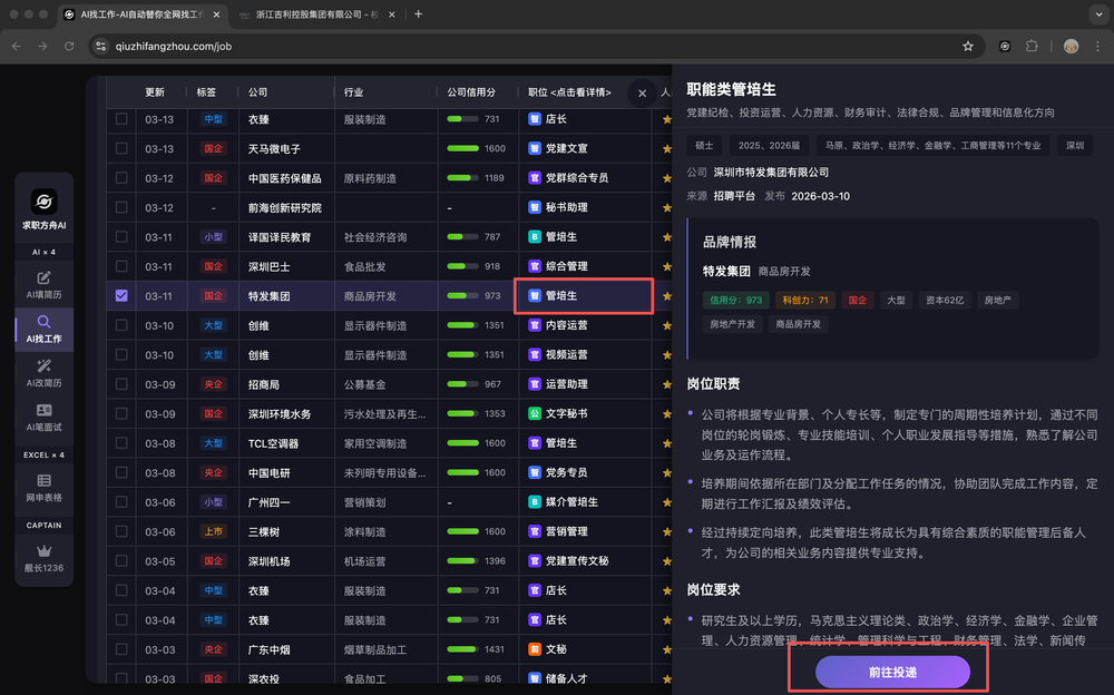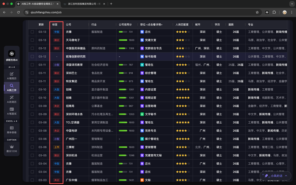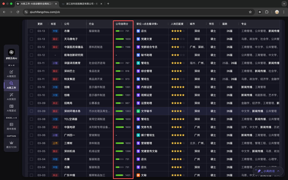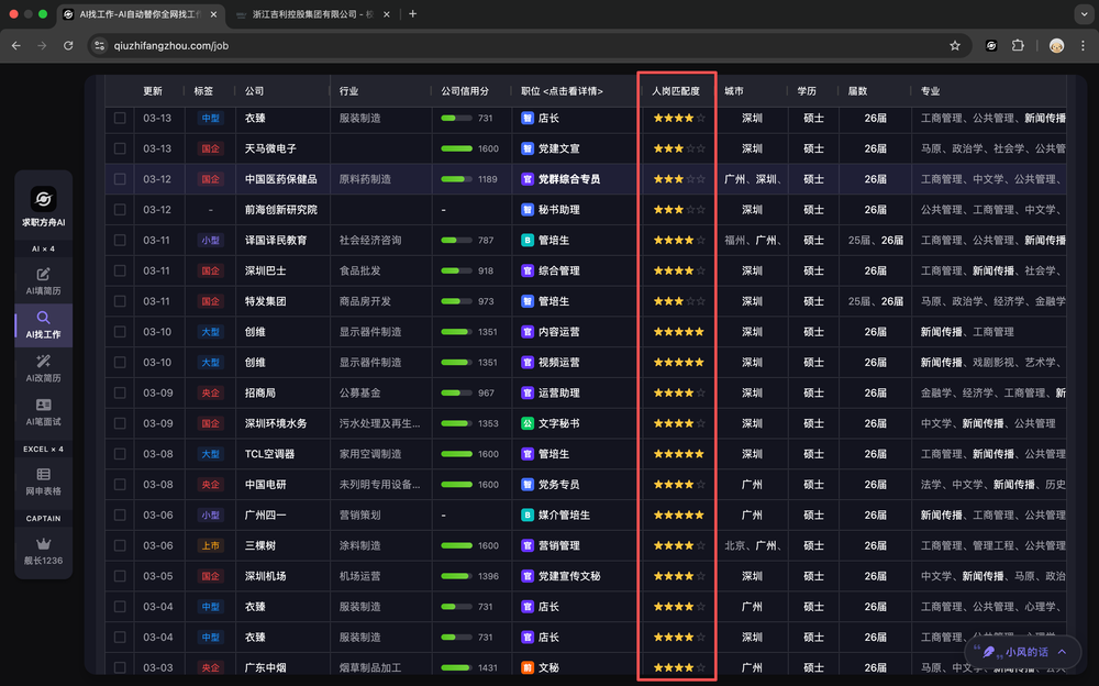 表格中的「人岗匹配度」列,会展示AI根据你的简历和求职偏好,对每一家公司和岗位的匹配度打分。匹配度越高,越适合你。