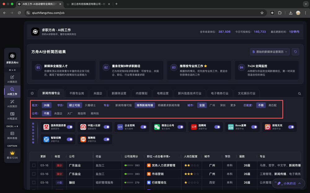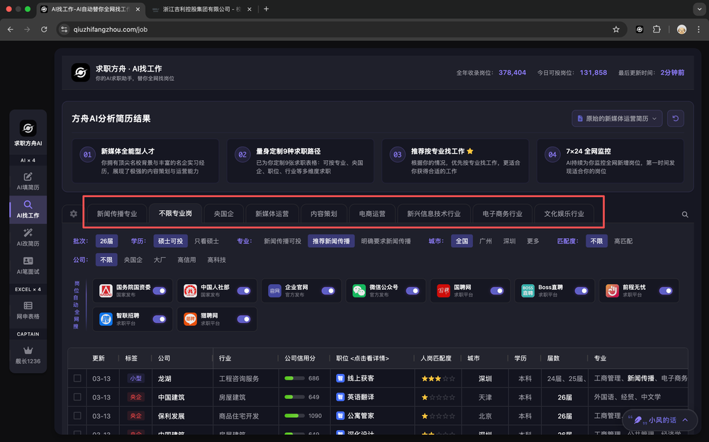 - 多维度筛选:支持按专业、央国企、岗位、行业等 9 种求职路径,可灵活调整学历、城市、匹配度等条件。