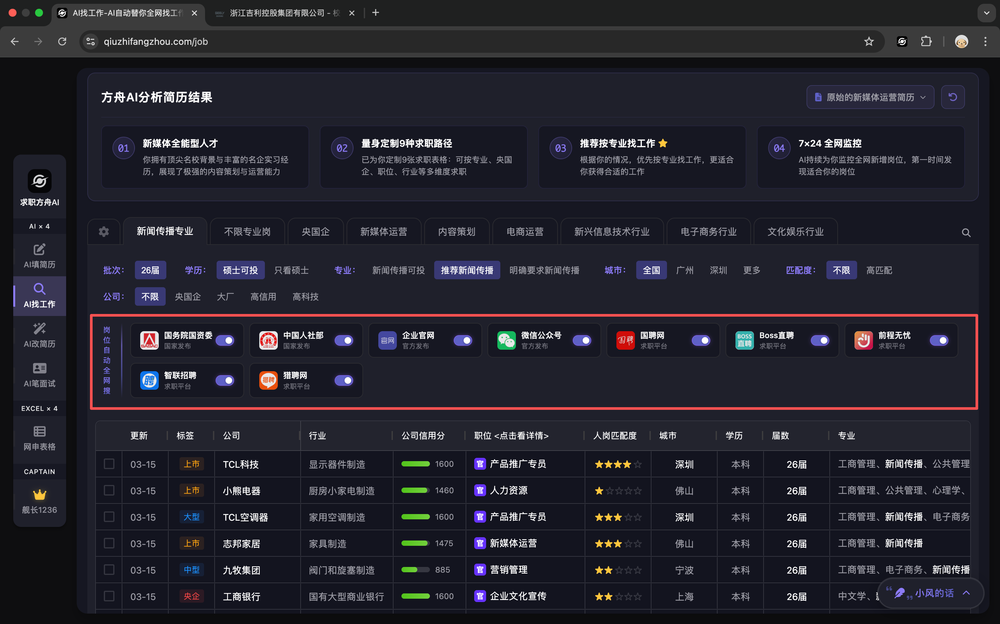 求职方舟的AI找工作,最大特色之一就是可监控全网岗位,做到一站式全渠道搜索,无需你再一个个搜索。基本上涵盖了所有应届生找岗位渠道。