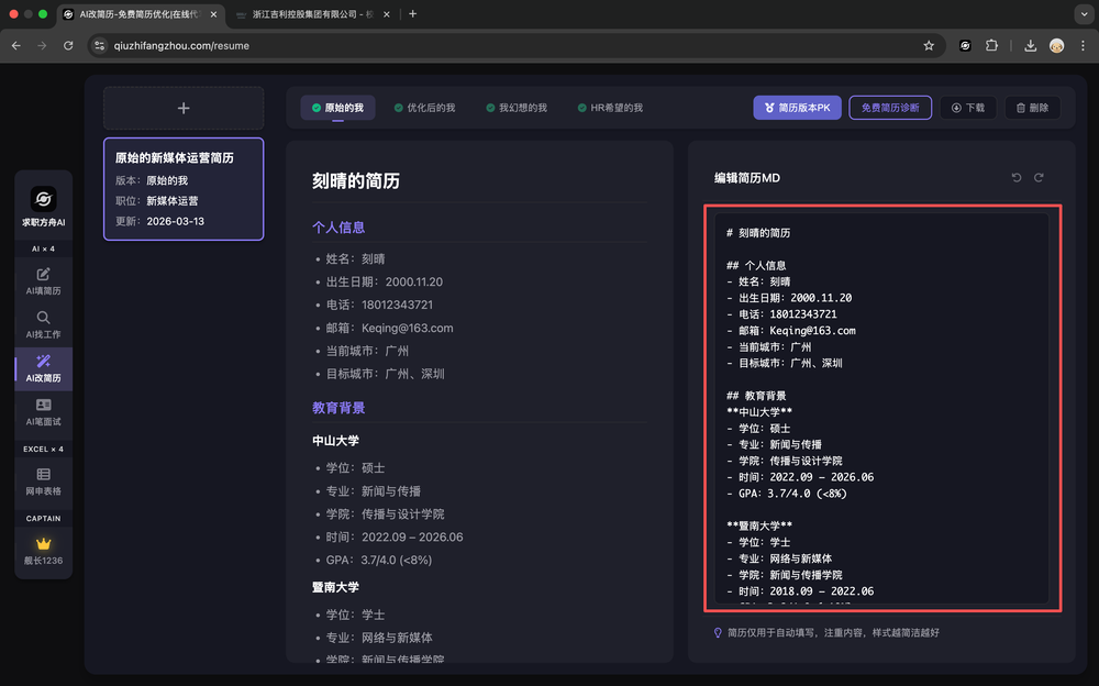 若你已在AI改简历页面上传过简历,可直接点击「分析简历」按钮,系统会自动分析简历。