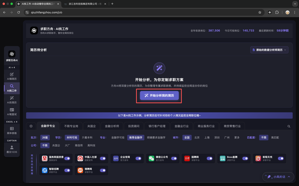 在 AI找工作页面上传最新简历。AI会自动分析你的简历。